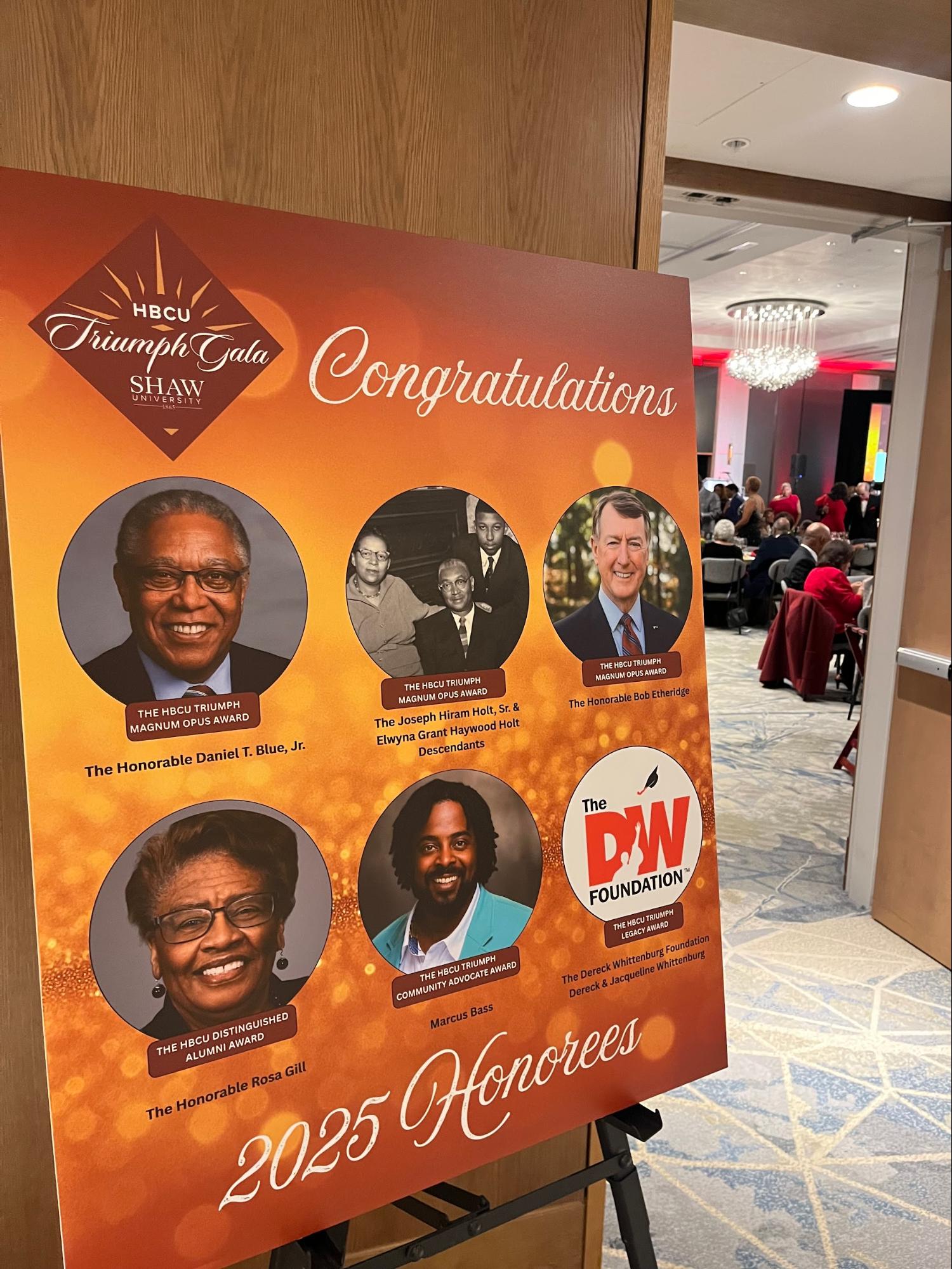 The 2025 Triumphant Honorees included: HBCU Triumph Magnum Opus Award: The Honorable Daniel T. Blue, Jr., Senator, NC State General Assembly. HBCU Triumph Community Activism Award: Mr. Marcus Bass, Deputy Director, NC Black Alliance. HBCU Triumph Legacy Award: The Dereck Whittenburg Foundation / Mr. & Mrs. Dereck & Jacqueline Whittenburg. Also celebrated, The Honorable Rosa Gill, Former Representative, NC State General Assembly, The Joseph Hiram Holt, Sr. & Elwyna Grant Haywood Holt Family and Descendants, and The Honorable Bob Etheridge, Former United States Congressman.
