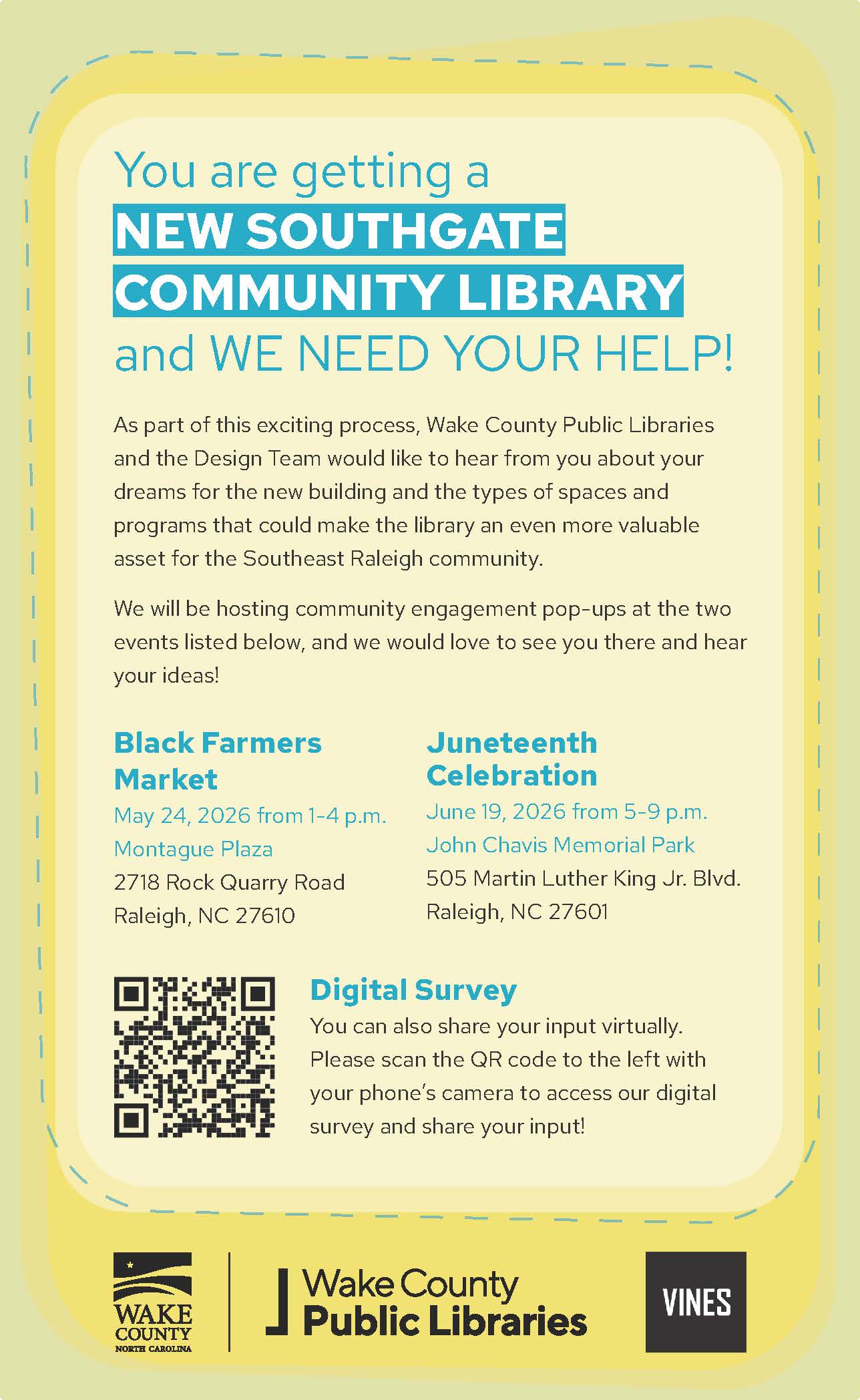RALEIGH, N.C. — Wake County Public Libraries will host a second community engagement pop-up event as part of Juneteenth celebrations, inviting residents to contribute input on the development of the new Southgate Community Library.